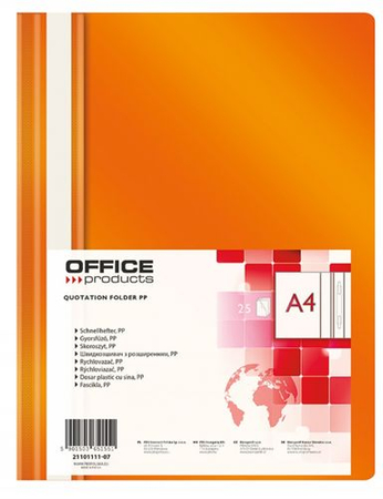 Skoroszyt OFFICE PRODUCTS, PP, A4, miękki, 100/170mikr., pomarańczowy